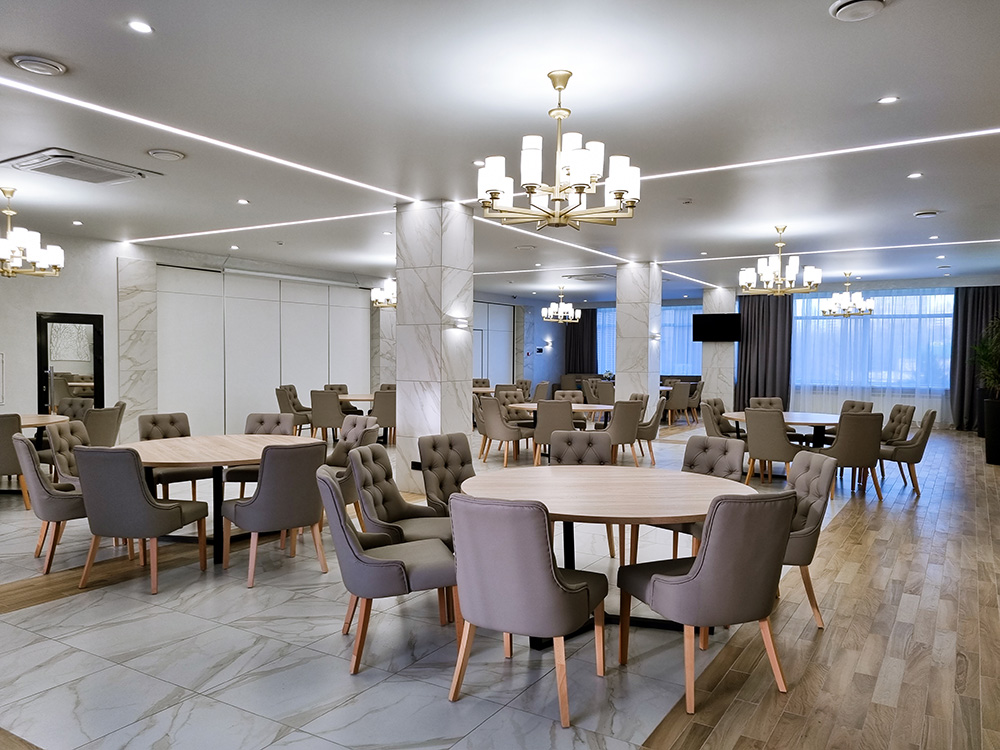При проведении мероприятия наш ресторанный комплекс организует питание для Ваших гостей: кофе-брейк, обед, ужин, фуршет и банкет.